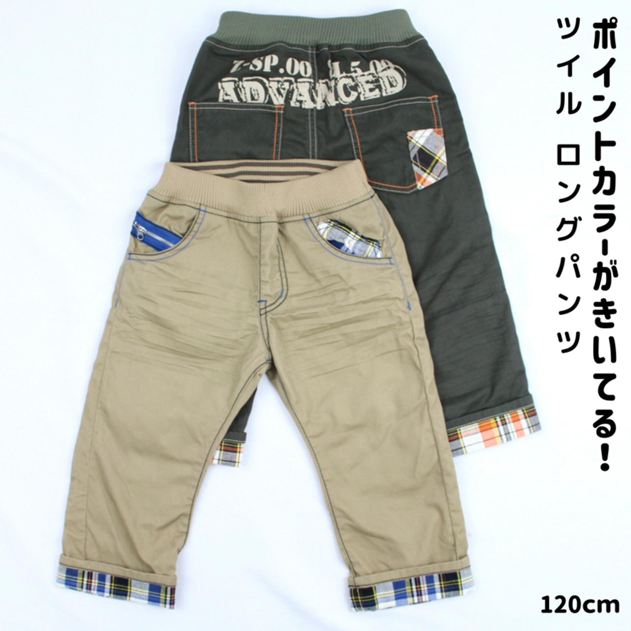 23128 ツイル チェック 配色 ロングパンツ | 子供服 キッズ 男の子 120 ベージュ カーキ 長ズボン ロールアップ